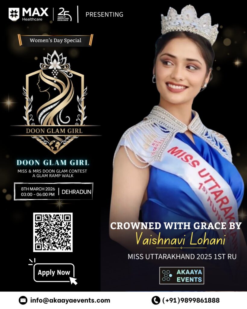 “दून ग्लैम गर्ल” (Miss & Mrs Doon Glam Contest) का आयोजन 8 मार्च 2026 को दोपहर 3 बजे से शाम 6 बजे तक किया जाएगा।