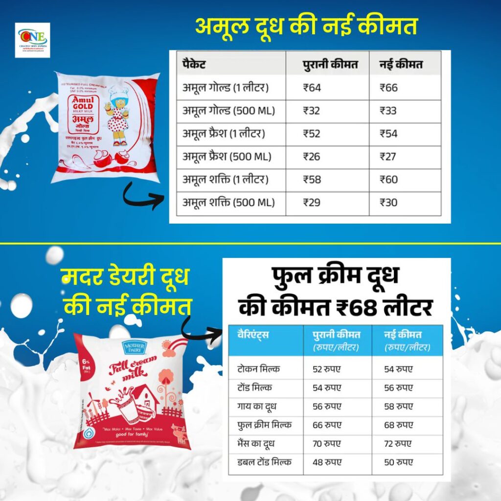अमूल और मदर डेयरी ने दूध के दाम में बढ़ोतरी की है। दोनों कंपनी ने 3 जून से दूध के दाम 2 रुपए प्रति लीटर बढ़ा दिए हैं। इस बढ़ोतरी के बाद अब मदर डेयरी के फुल क्रीम दूध की कीमत 68 रुपए प्रति लीटर हो गई है, जबकि टोंड दूध की कीमत 54 रुपए से बढ़ाकर 56 रुपए प्रति लीटर कर दी गई है। वहीं अमूल गोल्ड 1 लीटर की नई कीमत 66 रुपए जबकि 1 लीटर अमूल फ्रेश दूध की कीमत 52 रुपए से बढ़ाकर 54 रुपए प्रति लीटर कर दी गई है।