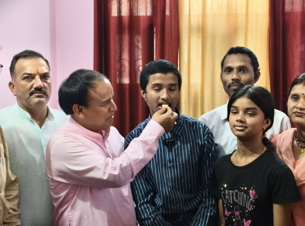 हाईस्कूल बोर्ड परीक्षा के टाॅपर अक्षत के घर पहुंचे शिक्षा मंत्री, दी बधाई